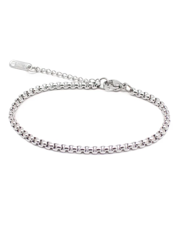 Βραχιόλι αλυσίδα σε ασημί χρώμα. Αποτελεί ένα διαχρονικό και κομψό αξεσουάρ για κάθε περίσταση. Ο καθαρός, μεταλλικός σχεδιασμός του προσδίδει διακριτική λάμψη και ταιριάζει εύκολα με κάθε look. Φορέστε το μόνο του για μια minimal και elegant εμφάνιση ή συνδυάστε το με άλλα βραχιόλια για ένα πιο μοντέρνο, layered στυλ που ξεχωρίζει.